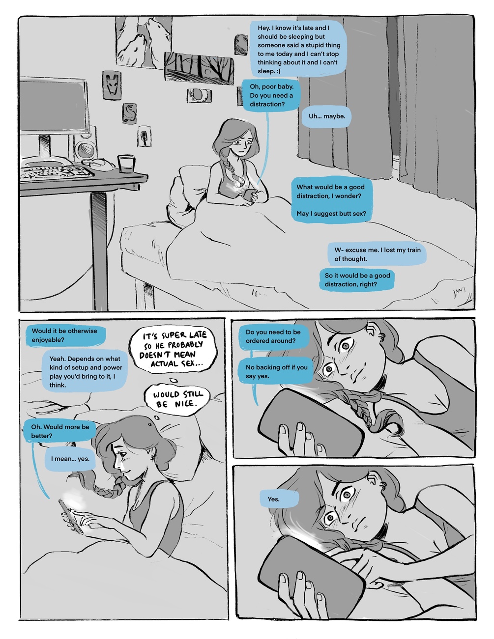 Yes is a lighthearted adults-only 45-page comic about what might happen when you find yourself sexting very late at night. If you like power play, silly banter, fingers in mouth, plugs, butts, breathplay and the like, you might like this too!